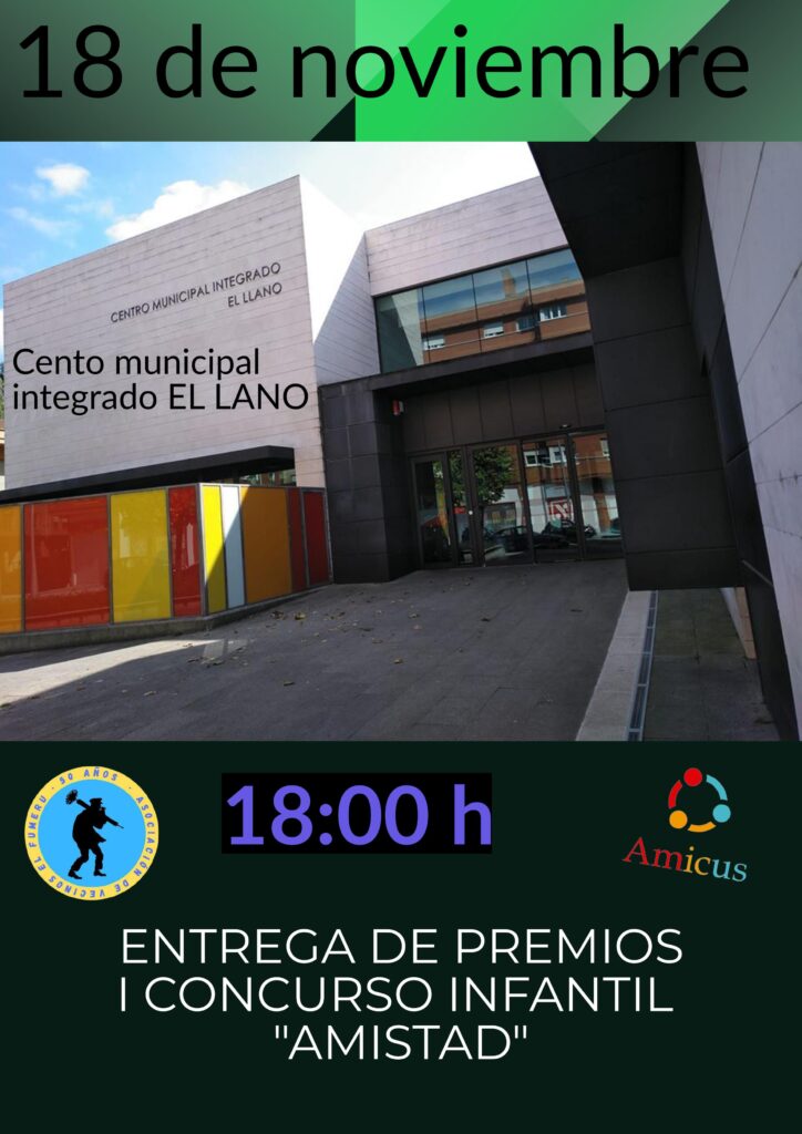 La Asociación Socio Cultural Amicus, colaboradora de nuestra asociación, que ha convocado el I Concurso Infantil «NIÑOS POR LA AMISTAD» en el cual se buscaba resaltar los valores de la amistad a través de la presentación por niños y niñas residentes en Gijón de hasta 12 años (incluídos) de trabajos en distintos formatos (fotografía, video, pintura, escritura…), hará entrega mañana viernes, 18 de noviembre a las 18:00h en el CMI El Llano, de los premios correspondientes al concurso, englobados en 2 categorías: