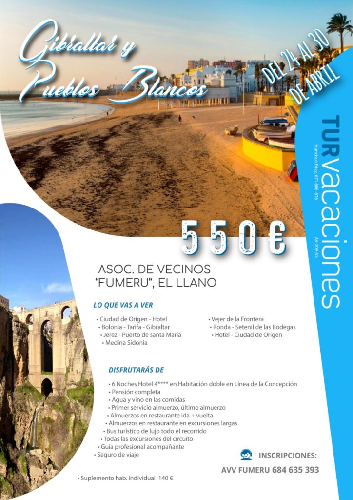 En él iremos en autobús de lujo, con guia turística durante todo el viaje, hasta Andalucía, alojándonos en el Ohtels Campo de Gibraltar, un bonito 4 estrellas situado en el puerto de la Linea de la Concepción y visitando distintos pueblos como Gibraltar, Tarifa, Ronda, Jerez, Vejer de la Frontera… que seguro que te encantarán.