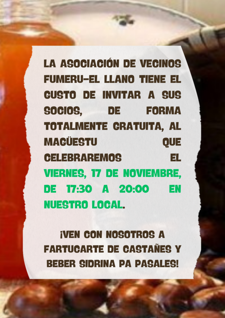 Este mismo viernes, 17 de noviembre, a partir de las 17:30 y de forma totalmente gratuita, la asociación ha organizado una pequeña fiesta para sus socios en la que tendremos castañinas asadas y sidra dulce a disposición de los socios que quieran pasarse por nuestro local.